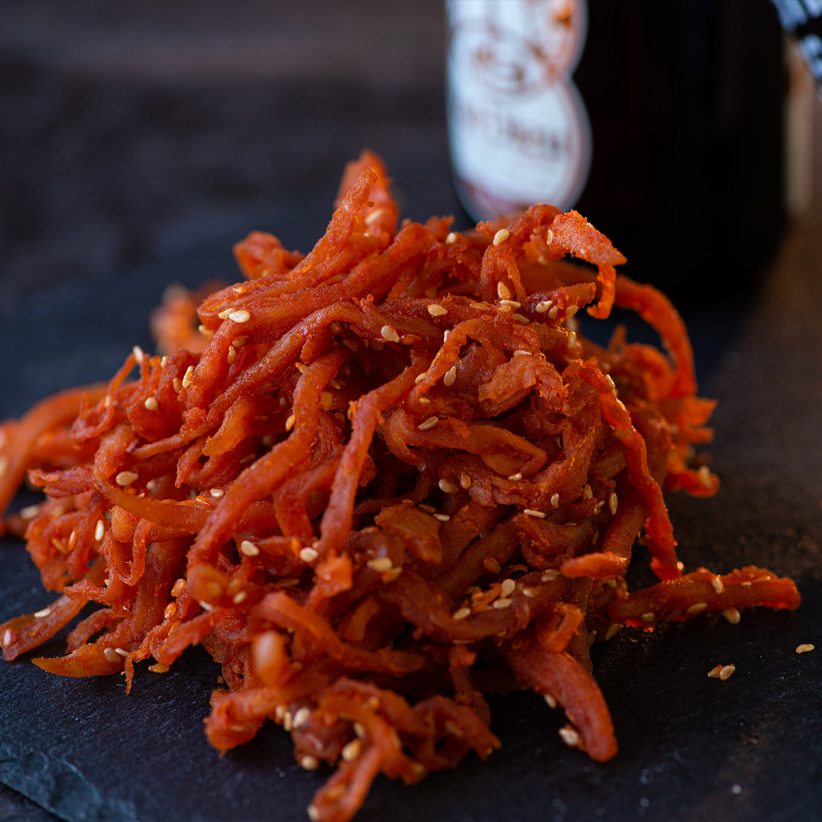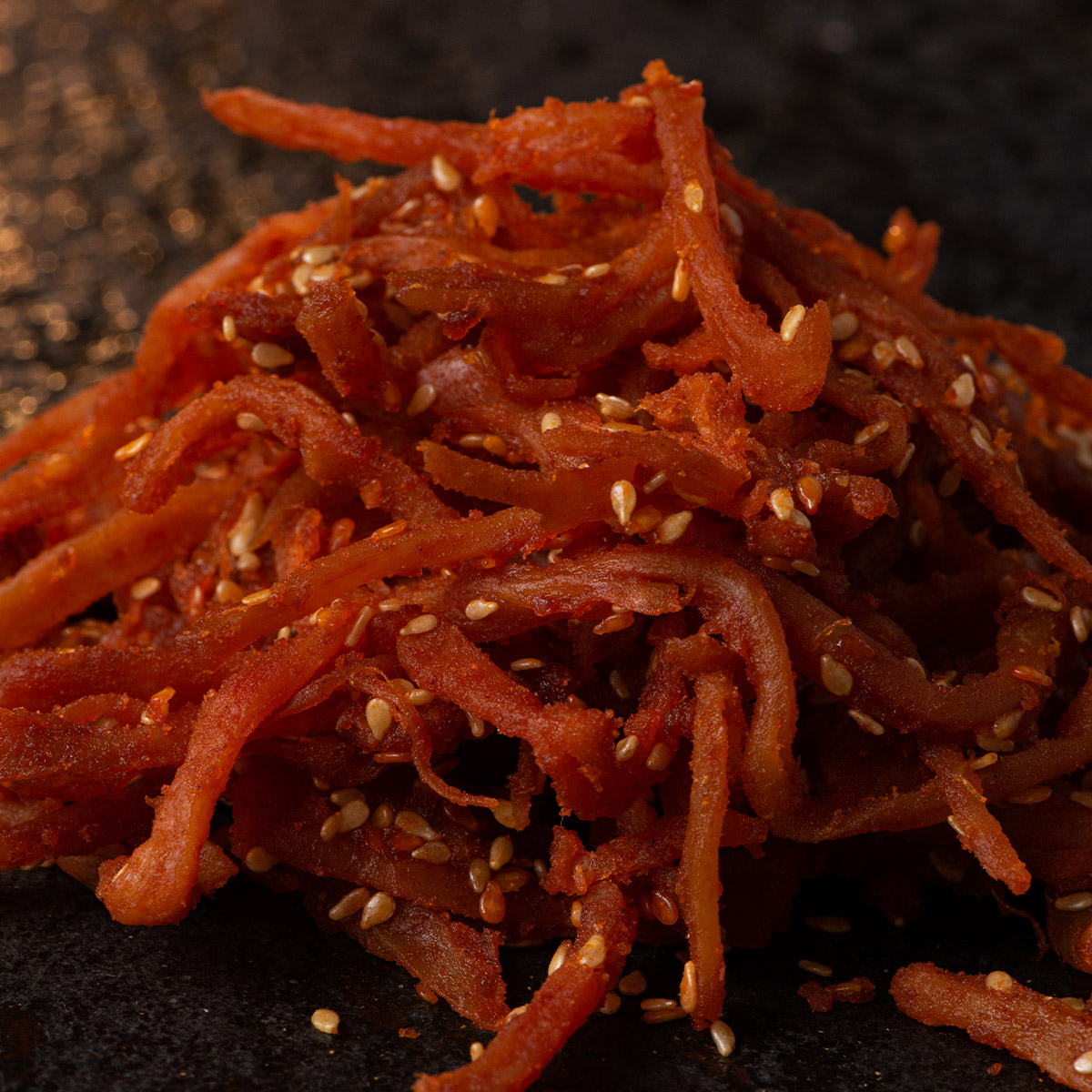 Кальмар (стружка) по-шанхайськи з кунжутом та перцем. Гострий смак перцю у поєднанні з кальмаром. Пікантна закуска для шанувальників пива.